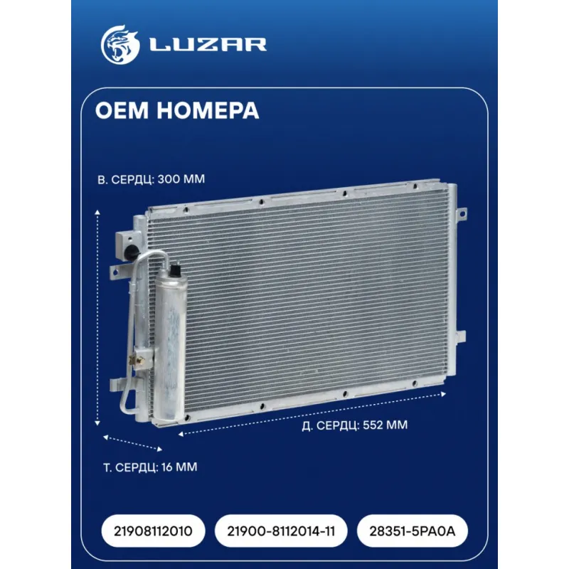 Радиатор кондиционера для автомобилей Гранта (10-) Характеристики: Артикул: LRAC 0190 OEM номера: 21908112010, 21900-8112014-11, 28351-5PA0A Количество на автомобиль: 1 Длина сердцевины, мм: 552 Высота сердцевины, мм: 300 Толщина сердцевины, мм: 16 Сопутствующий товар: Ресиверы-осушители: LCR 0127; Сопутствующий товар: Радиаторы охлаждения: LRc 01192b; LRc 01194; LRc 01900; LRc 0190b; LRc 0192b; LRc 0194 Сопутствующий товар: Электровентиляторы кондиционера: LFAC 0190 Сопутствующий товар: Электровентиляторы охлаждения: LFc 0190 Сопутствующий товар: Компрессоры кондиционера: LCAC 01272 Комплектующие конденсера: LCR 0127 Ресивер: + Подходит для авто: Datsun mi-DO (15-), on-DO (14-) ВАЗ Granta (10-), Kalina II (13-) Для проверки применяемости отправьте VIN автомобиля через вкладку "Есть вопросы о товаре?" Комплектация: Радиатор кондиционера в сборе с ресивером - 1 шт Паспорт изделия - 1 шт Радиатор кондиционера c ресивером - 1 шт Гарантия: от 1 года.