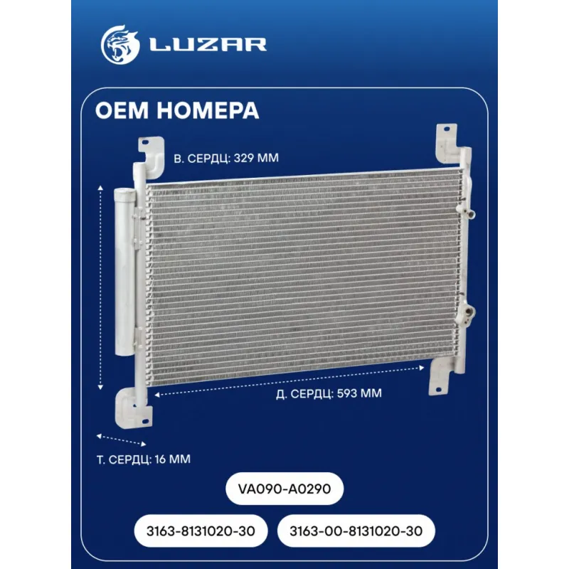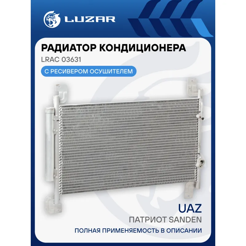 Радиатор кондиционера для автомобилей Патриот Sanden Характеристики: Артикул: LRAC 03631 OEM номера: 3163-8131020-30, 3163-00-8131020-30, VA090-A0290 Количество на автомобиль: 1 Длина сердцевины, мм: 593 Высота сердцевины, мм: 329 Толщина сердцевины, мм: 16 Сопутствующий товар: Компрессоры кондиционера: LCAC 0303 Ресивер: + Подходит для авто: УАЗ Patriot (08-), 3163 (Patriot) (05-), 31631, Patriot (08-) Для проверки применяемости отправьте VIN автомобиля через вкладку "Есть вопросы о товаре?" Комплектация: Радиатор кондиционера с ресивером Паспорт изделия Гарантия: от 1 года.