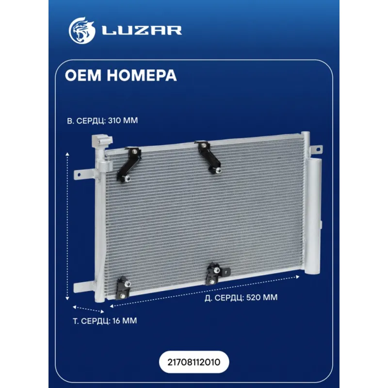 Радиатор кондиционера для автомобилей Приора (тип Panasonic) Характеристики: Артикул: LRAC 01272 OEM номера: 21708112010 Сопутствующий товар: Радиаторы охлаждения: LRc 01272b, LRc 0126; Сопутствующий товар: Электровентиляторы охлаждения: LFc 01272, LFK 0127; Сопутствующий товар: Электровентиляторы кондиционера: LFAC 0118; Сопутствующий товар: Компрессоры кондиционера: LCAC 01272 Сопутствующий товар: Ресиверы-осушители: LCD 0114 Комплектующие конденсера: LCD 0114 Количество на автомобиль: 1 Длина сердцевины, мм: 520 Высота сердцевины, мм: 310 Толщина сердцевины, мм: 16 Ресивер: + Подходит для авто: ВАЗ Priora (07-) Для проверки применяемости отправьте VIN автомобиля через вкладку "Есть вопросы о товаре?" Комплектация: Паспорт изделия - 1 шт Радиатор кондиционера c ресивером - 1 шт Гарантия: от 1 года.