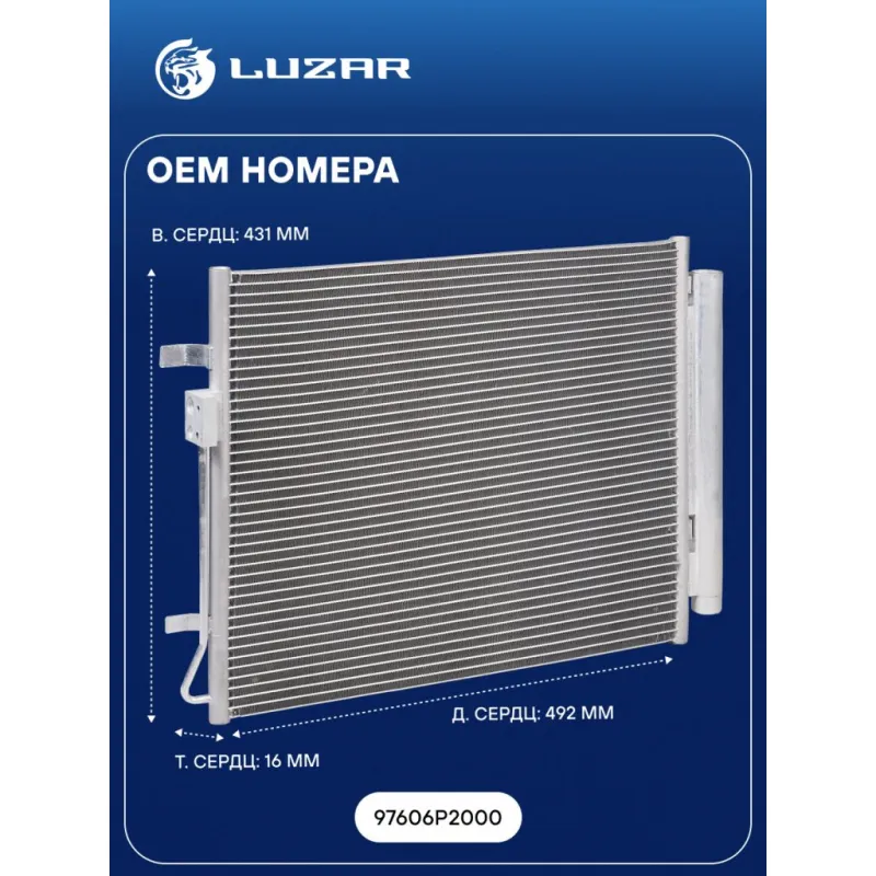 Радиатор кондиционера для автомобилей Santa Fe (18-) (выпуск с 2020г.)/Sorento (20-) 2.2D Характеристики: Артикул: LRAC 0882 OEM номера: 97606P2000 Комплектующие конденсера: LCD 0801 Количество на автомобиль: 1 Длина сердцевины, мм: 492 Высота сердцевины, мм: 431 Толщина сердцевины, мм: 16 осушитель: + Подходит для авто: Hyun... Читать полностью →