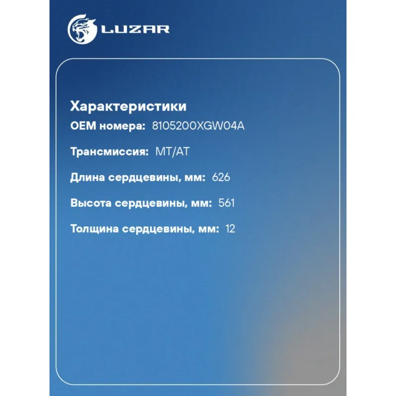 Радиатор кондиционера для автомобилей TANK 500 (21-) Характеристики: Артикул: LRAC 3056 OEM номера: 8105200XGW04A Длина сердцевины, мм: 626 Толщина сердцевины, мм: 12 Высота сердцевины, мм: 561 Количество на автомобиль: 1 Ресивер - осушитель: + Комплектация: Паспорт изделия - 1 шт Радиатор кондиционера c ресивером - 1 шт Гар... Читать полностью →
