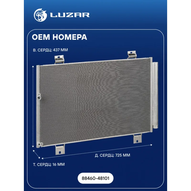 Радиатор кондиционера для автомобилей Toyota Highlander (07-) Характеристики: Артикул: LRAC 1938 OEM номера: 88460-48101 Комплектующие конденсера: LCD 0801 Количество на автомобиль: 1 Длина сердцевины, мм: 725 Высота сердцевины, мм: 437 Толщина сердцевины, мм: 16 Ресивер: + Подходит для авто: Toyota Highlander (08-) Для проверки применяемости отправьте VIN автомобиля через вкладку "Есть вопросы о товаре?" Комплектация: Радиатор кондиционера в сборе с ресивером - 1 шт Паспорт изделия - 1 шт Гарантия: от 1 года.