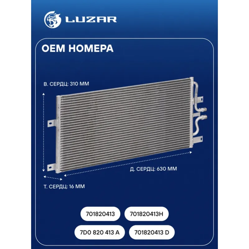Радиатор кондиционера для автомобилей Transporter T4 (90-) Характеристики: Артикул: LRAC 1804 OEM номера: 7D0 820 413 A, 701820413 D, 701820413, 701820413H Количество на автомобиль: 1 Длина сердцевины, мм: 630 Высота сердцевины, мм: 310 Толщина сердцевины, мм: 16 осушитель: - Подходит для авто: Volkswagen Transporter T4 (90-) Для проверки применяемости отправьте VIN автомобиля через вкладку "Есть вопросы о товаре?" Комплектация: Радиатор кондиционера Паспорт Паспорт изделия - 1 шт Радиатор кондиционера c ресивером - 1 шт Гарантия: от 1 года.