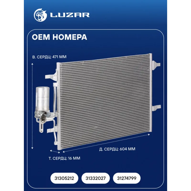Радиатор кондиционера для автомобилей Volvo S60 (10-)/S80 (13-)/XC60 (08-)/XC70 (07-) Характеристики: Артикул: LRAC 1060 OEM номера: 31305212, 31332027, 31274799 Количество на автомобиль: 1 Длина сердцевины, мм: 604 Высота сердцевины, мм: 471 Толщина сердцевины, мм: 16 Сопутствующий товар: Радиаторы охлаждения: LRc 10105 Сопутствующий товар: Электровентиляторы охлаждения: LFK 1060 Сопутствующий товар: Компрессоры кондиционера: LCAC 1010; LCAC 1054; LCAC 1055 Сопутствующий товар: Клапаны расширительные кондиционера (ТРВ): LTRV 1054 Ресивер: + Подходит для авто: Volvo S60 II (10-), S80 II (06-), V70 (07-), V70 (07-), XC60 (07-), S60 II (10-), S80 II (06-), V70 (07-), XC60 (07-), XC70 (07-) Для проверки применяемости отправьте VIN автомобиля через вкладку "Есть вопросы о товаре?" Комплектация: Радиатор кондиционера с ресивером в сборе - 1 шт Паспорт изделия - 1 шт Гарантия: от 1 года.