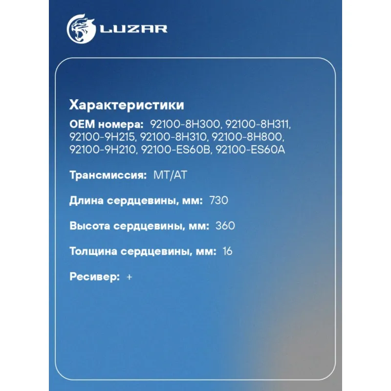 Радиатор кондиционера для автомобилей X-Trail (01-) Характеристики: Артикул: LRAC 14H8 OEM номера: 92100-8H300, 92100-8H311, 92100-9H215, 92100-8H310, 92100-8H800, 92100-9H210, 92100-ES60B, 92100-ES60A Количество на автомобиль: 1 Длина сердцевины, мм: 730 Высота сердцевины, мм: 360 Толщина сердцевины, мм: 16 Сопутствующий товар: Ресиверы-осушители: LCR 1402 Сопутствующий товар: Радиаторы охлаждения: LRc 141H8; LRc 14H8 Сопутствующий товар: Электровентиляторы охлаждения: LFK 1408 Сопутствующий товар: Компрессоры кондиционера: LCAC 1430 Сопутствующий товар: Клапаны расширительные кондиционера (ТРВ): LTRV 1408 Ресивер: + Сопутсвующий товар: Датчики давления хладагента: LRPS 1401 Подходит для авто: Nissan X-Trail T30 (01-), X-Trail T30 (01-) Для проверки применяемости отправьте VIN автомобиля через вкладку "Есть вопросы о товаре?" Комплектация: Радиатор кондиционера с ресивером в сборе - 1 шт Паспорт изделия - 1 шт Гарантия: от 1 года.