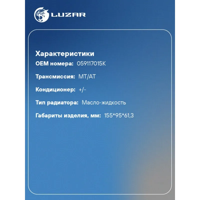 Радиатор масляный для а/м Audi Q7 (15-)/Q8 (18-)/VW Touareg (18-)/Amarok (09- 3.0D Характеристики: Артикул: LOc 1818 OEM номера: 059117015K Материал: алюминий Трансмиссия: MT/AT Кондиционер: +/- Тип радиатора: масло-жидкость Габариты изделия, мм: 155*95*61,3 Сопутствующий товар: Радиаторы охлаждения: LRc 1860 Сопутствующий товар: Радиаторы интеркулера (онв): LRIC 1806 Подходит для авто: Audi Q8 (18-), A8 (17-), Q7 (15-), A6 C8 (18-), A7 (18-) Volkswagen Touareg III (18-), Amarok (09-) Для проверки применяемости отправьте VIN автомобиля через вкладку "Есть вопросы о товаре?" Комплектация: Радиатор масляный - 1 шт Паспорт изделия - 1 шт Гарантия: от 1 года.