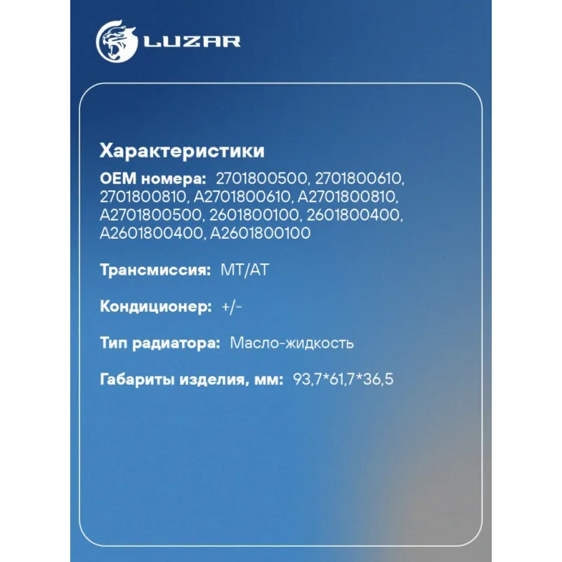Радиатор масляный для а/м Mercedes-Benz GLA (X156) (14-)/CLA (C117) (13-)/A (W176) (13-) 1.6i/2.0i Характеристики: Артикул: LOc 1511 OEM номера: 2701800500, 2701800610, 2701800810, A2701800610, A2701800810, A2701800500, 2601800100, 2601800400, A2601800400, A2601800100 Материал: алюминий Трансмиссия: MT/AT Кондиционер: +/- Тип радиатора: масло-жидкость Габариты изделия, мм: 93,7*61,7*36,5 Комплектация: уплотнительные прокладки в комплекте Подходит для авто: Mercedes-Benz A-Class W176 (12-), CLA C117 (13-), GLA X156 (13-), GLA H247 (20-) Для проверки применяемости отправьте VIN автомобиля через вкладку "Есть вопросы о товаре?" Комплектация: Радиатор масляный - 1 шт Паспорт изделия - 1 шт Уплотнительные прокладки - 2 шт Гарантия: от 1 года.
