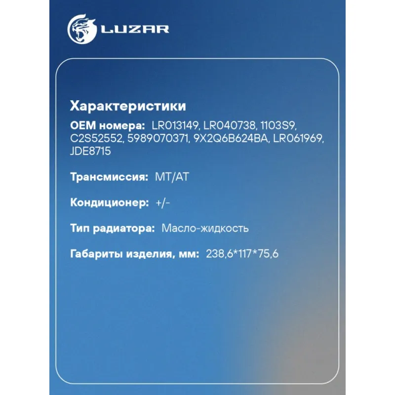 Радиатор масляный для автомобилей LR Range Rover IV (12-)/Range Rover Sport II (13-) 3.0TD Характеристики: Артикул: LOc 1009 OEM номера: LR013149, LR040738, 1103S9, C2S52552, 5989070371, 9X2Q6B624BA, LR061969, JDE8715 Материал: алюминий Трансмиссия: MT/AT Кондиционер: +/- Тип радиатора: масло-жидкость Габариты изделия, мм: 238,6*117*75,6 Сопутствующий товар: Радиаторы охлаждения: LRc 10170 Комплектация:: уплотнительные прокладки в комплекте Подходит для авто: Land Rover Range Rover IV (12-), Range Rover Sport II (13-), Discovery IV (09-), Range Rover Sport I (05-) Jaguar XF (07-) Для проверки применяемости отправьте VIN автомобиля через вкладку "Есть вопросы о товаре?" Комплектация: Паспорт изделия - 1 шт Радиатор масляный - 1 шт Уплотнительные прокладки - 1 шт Гарантия: от 1 года.