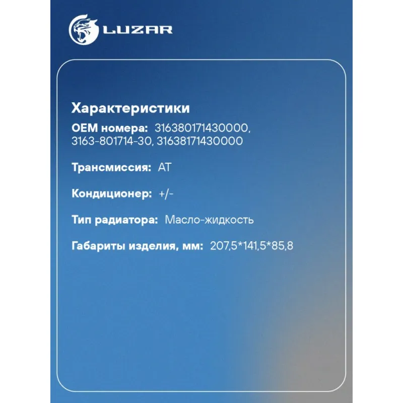 Радиатор масляный для автомобилей УАЗ 3163 Патриот (19-) AT (двигателя) Характеристики: Артикул: LOC 0310 OEM номера: 316380171430000, 3163-801714-30, 31638171430000 Материал: алюминий Тип радиатора: масло-жидкость Трансмиссия: AT Габариты изделия, мм: 207.5*141.5*85.8 Кондиционер: +/- Тип конструкции: маслоохладитель двигателя ... Читать полностью →