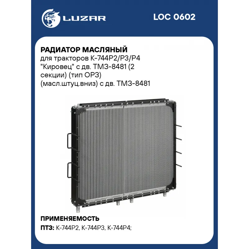 Радиатор масляный для тракторов К-744Р2/Р3/Р4 "Кировец" с дв. ТМЗ-8481 (2 секции) (тип ОРЗ) (масл.штуц.вниз) с дв. ТМЗ-8481 Характеристики: Артикул: LOC 0602 OEM номера: 744Р3-1013.000, 744Р3-1013.000-1, 744Р3-1301.0000 Материал: алюминий Тип радиатора: масло-воздух Трансмиссия: MT/AT Габариты изделия, мм: 1136*1001*175 Кондиционер: +/- Сопутствующий товар: Радиаторы охлаждения: LRc 0643 Тип конструкции: 2х секционный Материал сердцевины: алюминий Тип сердцевины: паяная Штуцеры под шланг диаметром: М30*2 Подходит для авто: ПТЗ К-744Р2 (02-), К-744Р3 (02-), К-744Р4 (02-) Для проверки применяемости отправьте VIN автомобиля через вкладку "Есть вопросы о товаре?" Комплектация: Радиатор масляный Паспорт изделия Гарантия: от 1 года.