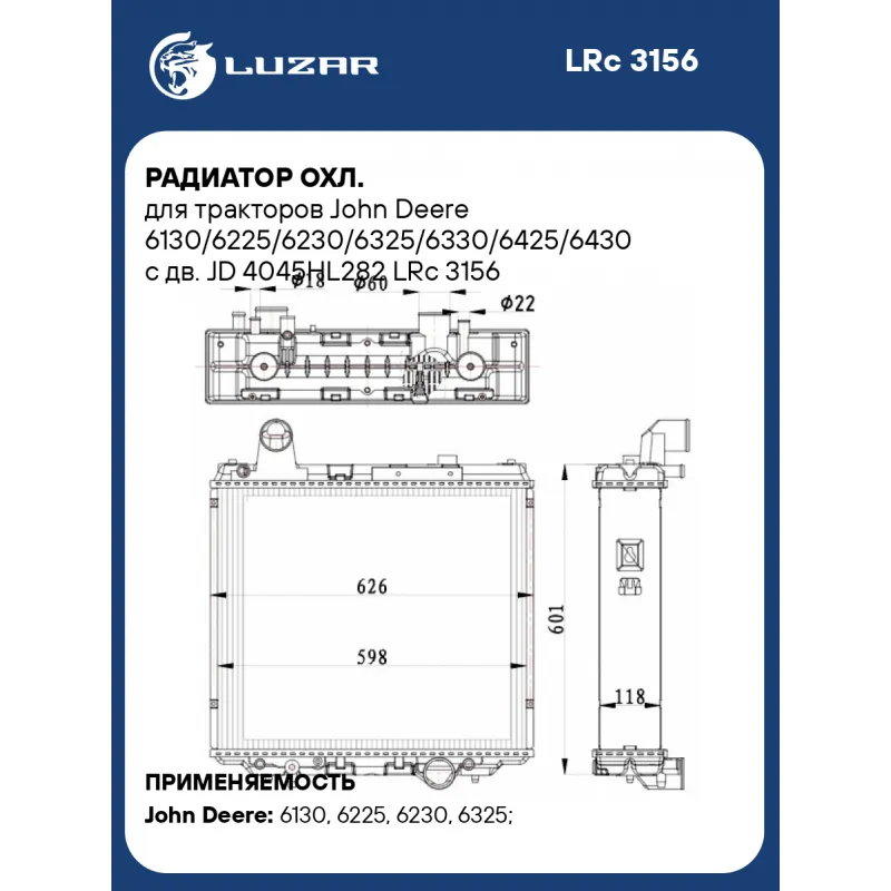 Радиатор охл. для тракторов John Deere 6130/6225/6230/6325/6330/6425/6430 с дв. JD 4045HL282 Характеристики: Артикул: LRc 3156 OEM номера: AL209032 Трансмиссия: MT Кондиционер: +/- Длина сердцевины, мм: 612 Высота сердцевины, мм: 506 Толщина сердцевины, мм: 118 Тип сердцевины: паяная, 2-х рядная Материал сердцевины: Алюминий Материал бачков: Алюминий Тип конструкции: сердцевина состоит из 2-х секций Подходит для авто: John Deere 6130, 6225, 6230, 6325, 6330, 6425, 6430 Для проверки применяемости отправьте VIN автомобиля через вкладку "Есть вопросы о товаре?" Комплектация: Радиатор охлаждения - 1 шт Паспорт изделия - 1 шт Гарантия: от 1 года.