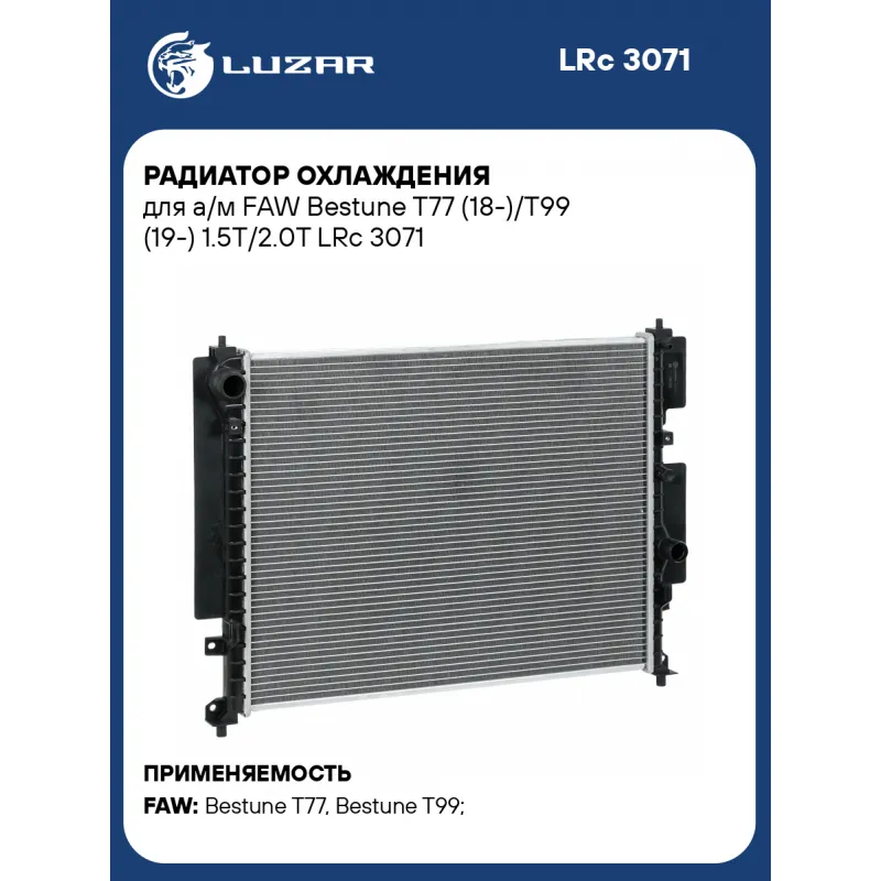 Радиатор охлаждения для а/м FAW Bestune T77 (18-)/T99 (19-) 1.5T/2.0T Характеристики: Артикул: LRc 3071 OEM номера: 1EA115200P1, 1EA115200 Трансмиссия: MT/AT Кондиционер: +/- Материал сердцевины: алюминий Материал бачков: пластик Тип сердцевины: паяная Длина сердцевины, мм: 619 Толщина сердцевины, мм: 26 Высота сердцевины, мм: 488 Подходит для авто: FAW Bestune T77 (18-), Bestune T99 (22-) Для проверки применяемости отправьте VIN автомобиля через вкладку "Есть вопросы о товаре?" Комплектация: Радиатор охлаждения - 1 шт Паспорт изделия - 1 шт Гарантия: от 1 года.