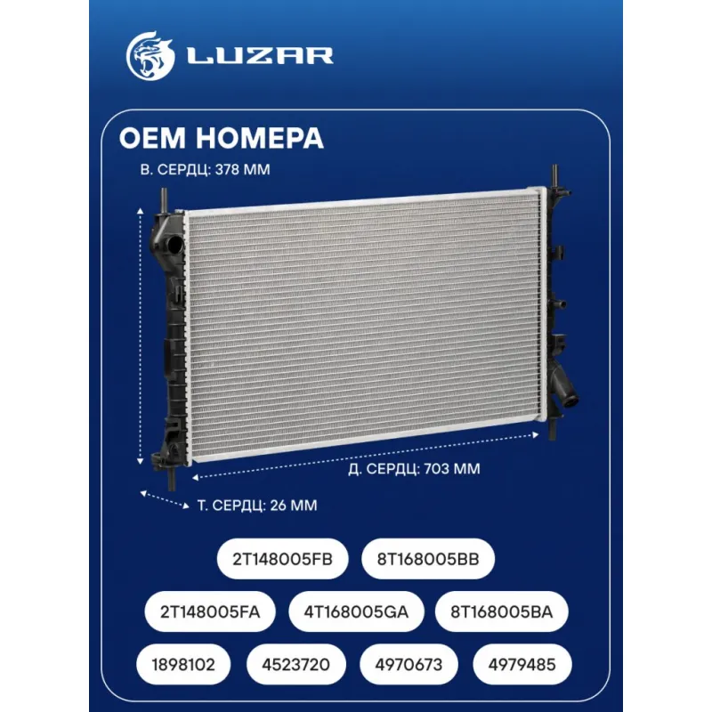 Радиатор охлаждения для а/м Ford Transit Connect (02-)/Tourneo Connect (02-) 1.8i/1.8D Характеристики: Артикул: LRc 1001 OEM номера: 1898102, 4523720, 4970673, 2T148005FA, 4T168005GA, 8T168005BA, 4979485, 2T148005FB, 8T168005BB, 1898105, ME8T168005BB, 4571640, 1365996, 5228316, 9T1Z8005A, 9T168005AA, ME4T168005GA Трансмиссия: MT Кондиционер: +/- Длина сердцевины, мм: 703 Высота сердцевины, мм: 378 Толщина сердцевины, мм: 26 Тип сердцевины: паяная Материал сердцевины: алюминий Материал бачков: пластик Сопутствующий товар: Радиаторы кондиционера (конденсеры): LRAC 1010 Подходит для авто: Ford Transit Connect (02-), Tourneo Connect I (02-), Transit Connect (02-) Для проверки применяемости отправьте VIN автомобиля через вкладку "Есть вопросы о товаре?" Комплектация: Радиатор охлаждения - 1 шт Паспорт изделия - 1 шт Гарантия: от 1 года.