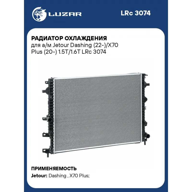 Радиатор охлаждения для а/м Jetour Dashing (22-)/X70 Plus (20-) 1.5T/1.6T Характеристики: Артикул: LRc 3074 OEM номера: F161301110GA Трансмиссия: MT/AT Кондиционер: +/- Материал сердцевины: алюминий Материал бачков: пластик Тип сердцевины: паяная Сопутствующий товар: Электровентиляторы охлаждения: LFK 3038 Длина сердцевины, мм: 645 Толщина сердцевины, мм: 20 Высота сердцевины, мм: 532 Подходит для авто: Jetour Dashing (22-), X70 Plus (20-) Для проверки применяемости отправьте VIN автомобиля через вкладку "Есть вопросы о товаре?" Комплектация: Радиатор охлаждения - 1 шт Паспорт изделия - 1 шт Гарантия: от 1 года.