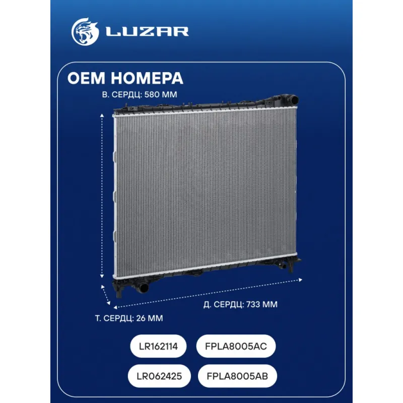 Радиатор охлаждения для а/м Land Rover Range Rover IV (12-)/Discovery V (17-) 3.0D Характеристики: Артикул: LRc 10171 OEM номера: LR062425, FPLA8005AB, FPLA8005AC, LR162114 Трансмиссия: MT/AT Кондиционер: +/- Материал сердцевины: алюминий Материал бачков: пластик Тип сердцевины: паяная Длина сердцевины, мм: 733 Толщина сердцевины, мм: 26 Высота сердцевины, мм: 580 Примечание: отличается от LRc 10170 наличием пароотв. патрубка на заднем верхнем бачке Подходит для авто: Land Rover Range Rover IV (12-) Для проверки применяемости отправьте VIN автомобиля через вкладку "Есть вопросы о товаре?" Комплектация: Радиатор охлаждения - 1 шт Паспорт изделия - 1 шт Гарантия: от 1 года.