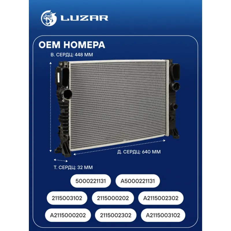 Радиатор охлаждения для а/м Mercedes-Benz E (W211) (02-) 1.8i/3.5i/5.0i/2.1D/2.7D Характеристики: Артикул: LRc 1517 OEM номера: 2115003102, 2115000202, A2115002302, A2115000202, 2115002302, A2115003102, 5000221131, A5000221131 Трансмиссия: MT/AT Кондиционер: +/- Длина сердцевины, мм: 640 Высота сердцевины, мм: 448 Толщина сердцевины, мм: 32 Тип сердцевины: паяная Материал сердцевины: алюминий Материал бачков: пластик Сопутствующий товар: Электровентиляторы охлаждения: LFK 15211 Подходит для авто: Mercedes-Benz E-Class W211 (02-), CLS C219 (04-), CLS C219 (04-) Для проверки применяемости отправьте VIN автомобиля через вкладку "Есть вопросы о товаре?" Комплектация: Радиатор охлаждения - 1 шт Паспорт изделия - 1 шт Гарантия: от 1 года.