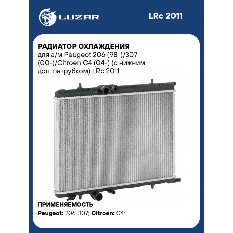 Радиатор охлаждения для а/м Peugeot 206 (98-)/307 (00-)/Citroen C4 (04-) (с нижним доп. патрубком) Характеристики: Артикул: LRc 2011 OEM номера: 1330.96, 1330.F7, 1330.P0, 1333.10 Трансмиссия: MT/AT Кондиционер: +/- Материал сердцевины: алюминий Материал бачков: пластик Тип сердцевины: паяная Сопутствующий товар: Радиаторы кондиционера (конденсеры): LRAC 2009 Сопутствующий товар: Крышки (пробки) расширительного бачка: LL 2020 Сопутствующий товар: Электровентиляторы охлаждения: LFK 20308 Длина сердцевины, мм: 538 Толщина сердцевины, мм: 26 Высота сердцевины, мм: 380 Примечание: от LRc 2009 отличается наличием доп.патрубка на нижнем бачке Подходит для авто: Peugeot 206 (00-), 307 (00-) Citroen C4 (04-) Для проверки применяемости отправьте VIN автомобиля через вкладку "Есть вопросы о товаре?" Комплектация: Радиатор охлаждения - 1 шт Паспорт изделия - 1 шт Гарантия: от 1 года.