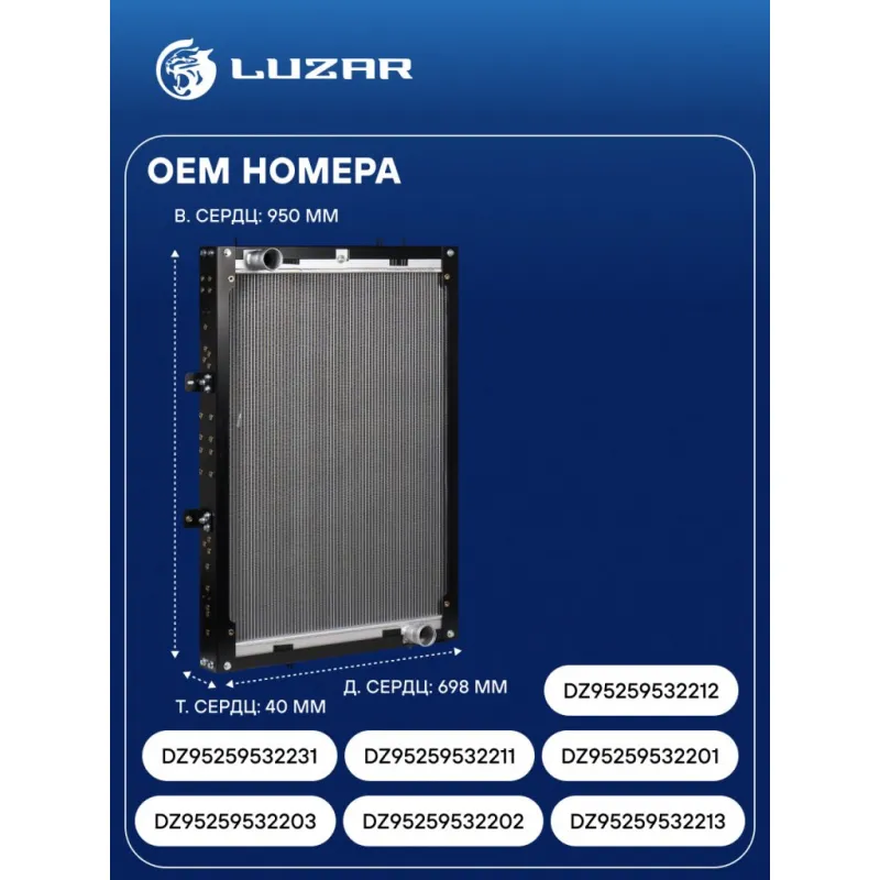 Радиатор охлаждения для а/м Shacman F2000/F3000/X3000 с двиг. WP10/12/Cummins M11 (с рамкой) Характеристики: Артикул: LRc 3063 OEM номера: DZ95259532231 , DZ95259532211, DZ95259532201, DZ95259532203, DZ95259532202, DZ95259532213, DZ95259532212 Трансмиссия: MT/AT Кондиционер: +/- Длина сердцевины, мм: 698 Высота сердцевины, мм: 950 Толщина сердцевины, мм: 40 Тип сердцевины: паяная Материал сердцевины: алюминий Материал бачков: пластик Тип конструкции: с металлической рамкой Подходит для авто: SHACMAN F2000 (04-), F3000 (12-), X3000 (13-) Для проверки применяемости отправьте VIN автомобиля через вкладку "Есть вопросы о товаре?" Комплектация: Радиатор охлаждения Паспорт изделия Гарантия: от 1 года.