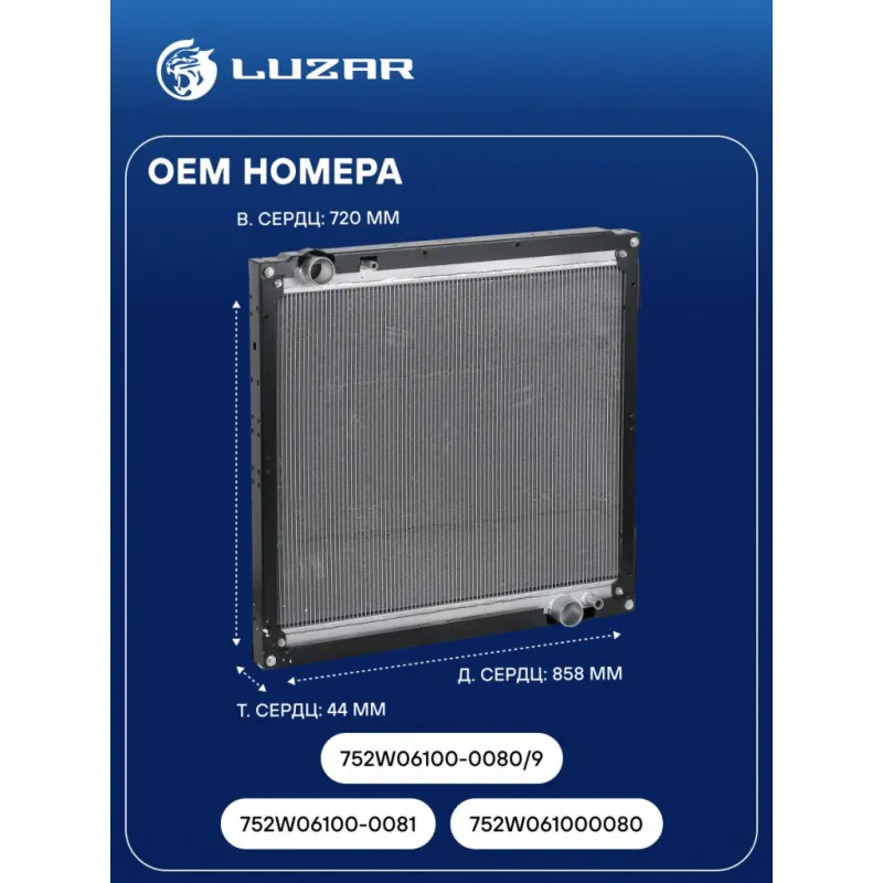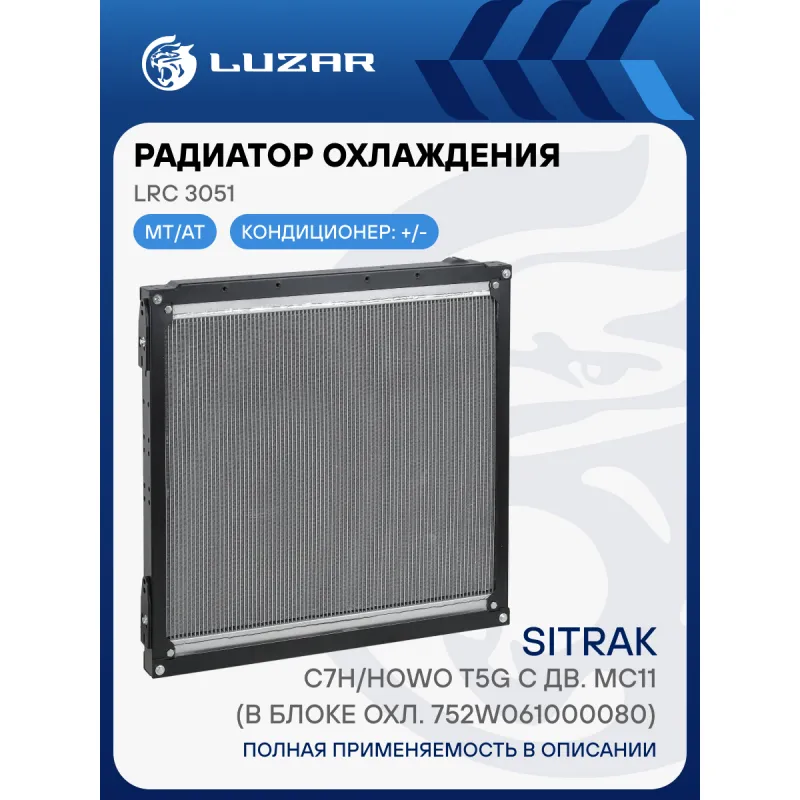 Радиатор охлаждения для а/м Sitrak C7H/Howo T5G с дв. MC11 (в блоке охл. 752W061000080) Характеристики: Артикул: LRc 3051 OEM номера: 752W06100-0081, 752W061000080, 752W06100-0080/9 Трансмиссия: MT/AT Кондиционер: +/- Материал сердцевины: алюминий Материал бачков: алюминий Тип сердцевины: паяная, 2-х рядная Сопутствующий товар: Радиаторы интеркулера (онв): LRIC 3031 Длина сердцевины, мм: 858 Толщина сердцевины, мм: 44 Высота сердцевины, мм: 720 Применяемость: входит в состав блока охлаждения 752W061000080 Подходит для авто: Howo T5G SITRAK C7H Для проверки применяемости отправьте VIN автомобиля через вкладку "Есть вопросы о товаре?" Комплектация: Радиатор охлаждения - 1 шт Паспорт изделия - 1 шт Гарантия: от 1 года.