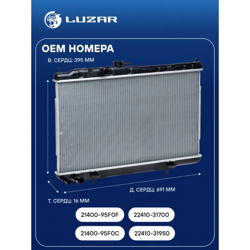 Радиатор охлаждения для автомобилей Almera Classic (05-) MT Характеристики: Артикул: LRc 14FC OEM номера: 21400-95F0C, 22410-31950, 21400-95F0F, 22410-31700 Сопутствующий товар: Патрубки охлаждения (комплект): LPK 14011, LPK 14012 Трансмиссия: MT Кондиционер: +/- Длина сердцевины, мм: 691 Высота сердцевины, мм: 395 Толщина сердцевины, мм: 16 Сопутствующий товар: Электровентиляторы охлаждения: LFK 1410 Сопутствующий товар: Радиаторы кондиционера (конденсеры): LRAC 14FC Подходит для авто: Nissan Almera Classic B10 (06-) Для проверки применяемости отправьте VIN автомобиля через вкладку "Есть вопросы о товаре?" Комплектация: Радиатор охлаждения Паспорт изделия Гарантия: от 1 года.