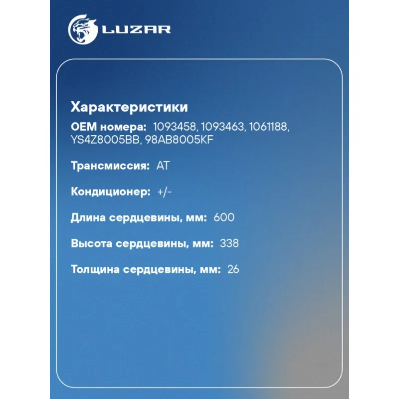 Радиатор охлаждения для автомобилей Focus I (98-) AT Характеристики: Артикул: LRc FDFs98258 OEM номера: 1093458, 1093463, 1061188, YS4Z8005BB, 98AB8005KF Трансмиссия: AT Кондиционер: +/- Длина сердцевины, мм: 600 Высота сердцевины, мм: 338 Толщина сердцевины, мм: 26 Сопутствующий товар: Электровентиляторы охлаждения: LFK 1051; LFK 1054 Сопутствующий товар: Радиаторы кондиционера (конденсеры): LRAC FDFs98390 Подходит для авто: Ford Focus I (98-) Для проверки применяемости отправьте VIN автомобиля через вкладку "Есть вопросы о товаре?" Комплектация: Радиатор охлаждения Паспорт изделия Гарантия: от 1 года.