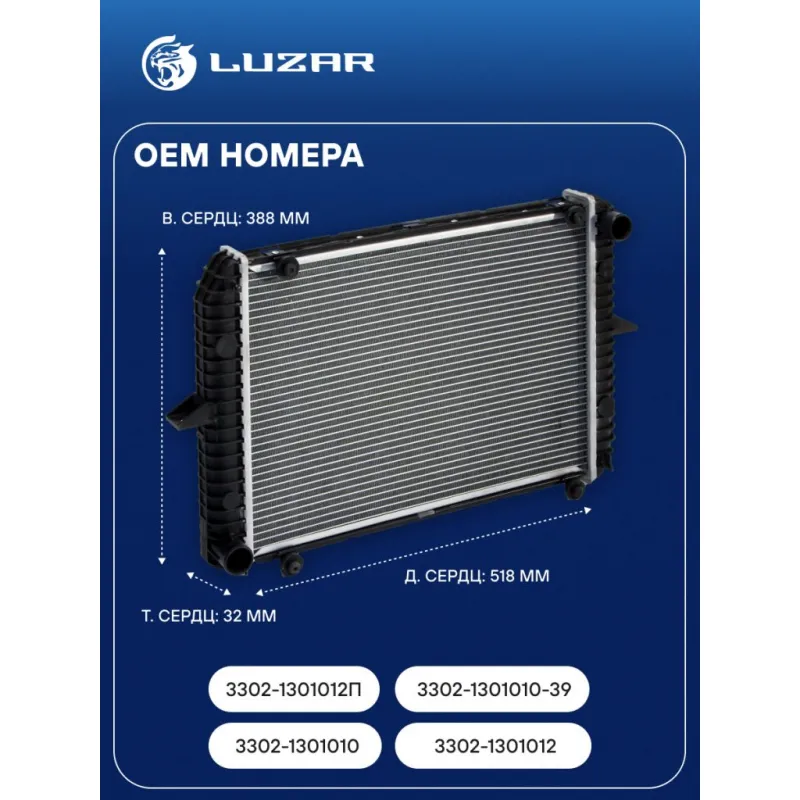 Радиатор охлаждения для автомобилей ГАЗ 3302 ГАЗель (-99) (паяный) Характеристики: Артикул: LRc 0302b OEM номера: 3302-1301012П, 3302-1301012, 3302-1301010, 3302-1301010-39 Сопутствующий товар: Патрубки охлаждения (комплект): LPK0302 Трансмиссия: MT Кондиционер: - Длина сердцевины, мм: 518 Высота сердцевины, мм: 388 Толщина сердцевины, мм: 32 Тип сердцевины: паяная Аналог: LRc 0320 (сборная сердцевина) Подходит для авто: ГАЗ 3302, 3302, 2217, 2217, 2752, 2752, 2705, 2705, 3221, 3221, 2752, 2705, 3221 Для проверки применяемости отправьте VIN автомобиля через вкладку "Есть вопросы о товаре?" Комплектация: Радиатор охлаждения Паспорт изделия Гарантия: от 1 года.