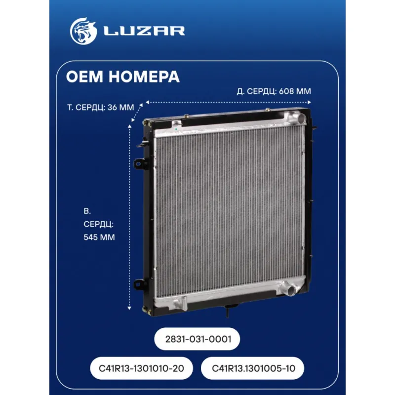Радиатор охлаждения для автомобилей ГАЗон Next (15-) с двигателем ЯМЗ 534 Характеристики: Артикул: LRc 0341 OEM номера: C41R13-1301010-20, 2831-031-0001, C41R13.1301005-10 Трансмиссия: MT Кондиционер: +/- Длина сердцевины, мм: 608 Высота сердцевины, мм: 545 Толщина сердцевины, мм: 36 Тип сердцевины: паяная Материал сердцевины: алюминий Материал бачков: алюминий Сопутствующий товар: Патрубки охлаждения (комплект): LPK 0312, LPK 0312s Тип конструкции: с металлической рамой Подходит для авто: ГАЗ GAZon-Next (14-), C41R11, C41K31 Для проверки применяемости отправьте VIN автомобиля через вкладку "Есть вопросы о товаре?" Комплектация: Радиатор охлаждения Паспорт изделия Гарантия: от 1 года.
