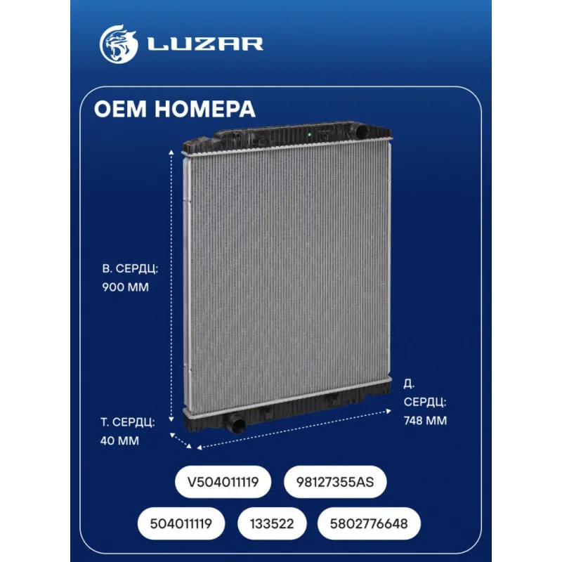 Радиатор охлаждения для автомобилей Iveco Stralis (02-)/(12-) для кабин "AD,AT" (без рамки) Характеристики: Артикул: LRc 1619 OEM номера: 504011119, 133522, 5802776648, V504011119, 98127355AS Трансмиссия: MT Кондиционер: +/- Длина сердцевины, мм: 748 Высота сердцевины, мм: 900 Толщина сердцевины, мм: 48 Тип сердцевины: паяная Материал бачков: пластик Сопутствующий товар: Радиаторы кондиционера (конденсеры): LRAC 1663 Тип конструкции: без металлической рамки Подходит для авто: Iveco Stralis (03-), Stralis (12-) Для проверки применяемости отправьте VIN автомобиля через вкладку "Есть вопросы о товаре?" Комплектация: Радиатор охлаждения Паспорт изделия Гарантия: от 1 года.