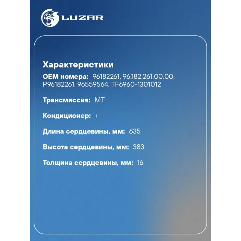 Радиатор охлаждения для а/м Chevrolet Lanos (02-) 1.5i/1.6i MT A/C+ (паяный) Характеристики: Артикул: LRc 0561b OEM номера: 96182261, 96.182.261.00.00, P96182261, 96559564, TF6960-1301012 Трансмиссия: MT Кондиционер: + Длина сердцевины, мм: 635 Высота сердцевины, мм: 383 Толщина сердцевины, мм: 16 Сопутствующий товар: Электровентиляторы охлаждения: LFc 0580 Сопутствующий товар: Электровентиляторы кондиционера: LFc 0563 Сопутствующий товар: Радиаторы кондиционера (конденсеры): LRAC CHLs0235 Сопутствующий товар: Крышки (пробки) расширительного бачка: LL 0563 Сопутствующий товар: Патрубки охлаждения (комплект): LPK 0561; LPK 05610 Аналог: LRc 0561 (со сборной сердцевиной) Подходит для авто: ЗАЗ Chance (09-) Daewoo Lanos (97-) Chevrolet Lanos (97-) Для проверки применяемости отправьте VIN автомобиля через вкладку "Есть вопросы о товаре?" Комплектация: Радиатор охлаждения Гарантийный талон Гарантия: от 1 года.