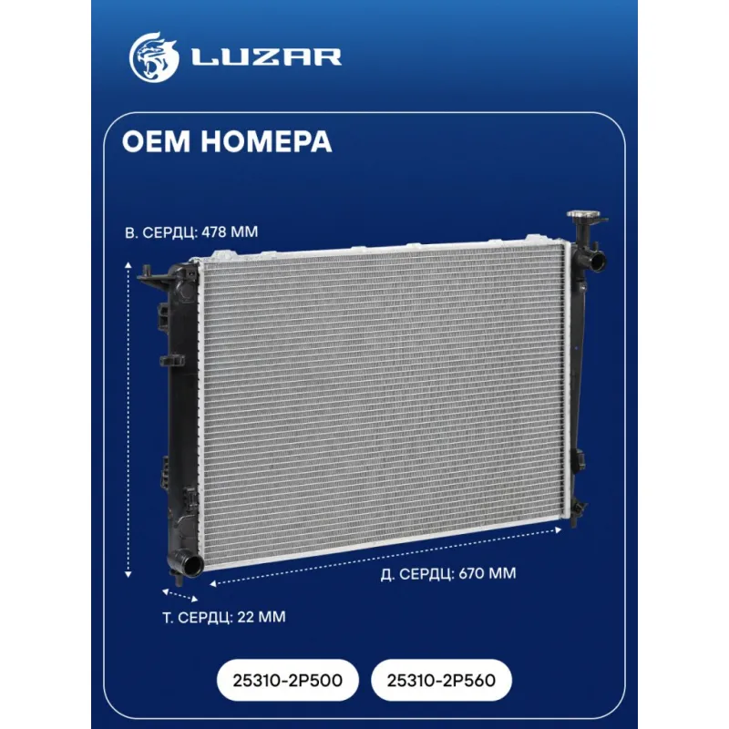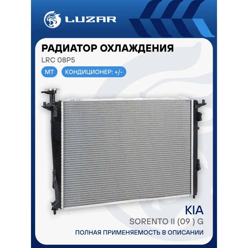 Радиатор охлаждения для автомобилей Sorento II (09-) G MT Характеристики: Артикул: LRc 08P5 OEM номера: 25310-2P500, 25310-2P560 Трансмиссия: MT Кондиционер: +/- Длина сердцевины, мм: 670 Высота сердцевины, мм: 478 Толщина сердцевины, мм: 22 Сопутствующий товар: Электровентиляторы охлаждения: LFK 08P5 Сопутствующий товар: Радиаторы кондиционера (конденсеры): LRAC 0822 Подходит для авто: Kia Sorento II (09-) Hyundai Santa Fe III (12-) Для проверки применяемости отправьте VIN автомобиля через вкладку "Есть вопросы о товаре?" Комплектация: Радиатор охлаждения Паспорт изделия Гарантия: от 1 года.