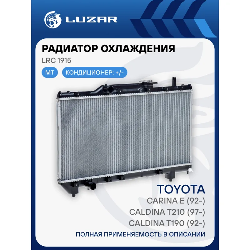 Радиатор охлаждения для а/м Toyota Carina E (92-)/Caldina T190 (92-)/Caldina T210 (97-)/Corona T190 (92-)/Caldina T210 (96-) MT Характеристики: Артикул: LRc 1915 OEM номера: 16400-15570, 16400-02160, 16400-16470, 16400-16450, 16400-16570, 16400-16571, 16400-16780 Трансмиссия: MT Кондиционер: +/- Длина сердцевины, мм: 658 Высота сердцевины, мм: 325 Толщина сердцевины, мм: 16 Сопутствующий товар: Крышки (пробки) радиатора: LL 1903 Подходит для авто: Toyota Caldina I T190 (92-), Corona IX T190 (92-), Corona X T210 (96-), Caldina II T210 (97-), Carina VII T210 (96-), Carina VI T190 (92-), Carina E (92-) Для проверки применяемости отправьте VIN автомобиля через вкладку "Есть вопросы о товаре?" Комплектация: Радиатор охлаждения Паспорт изделия Гарантия: от 1 года.