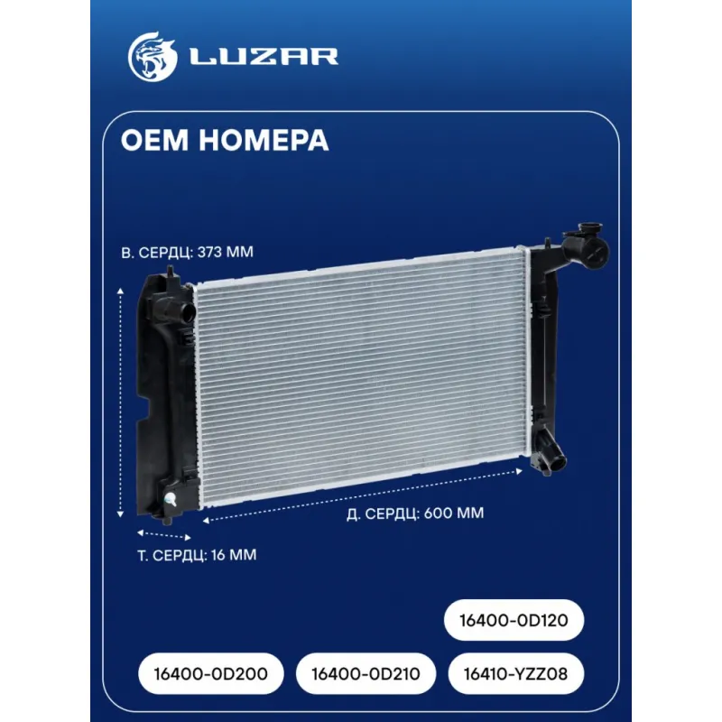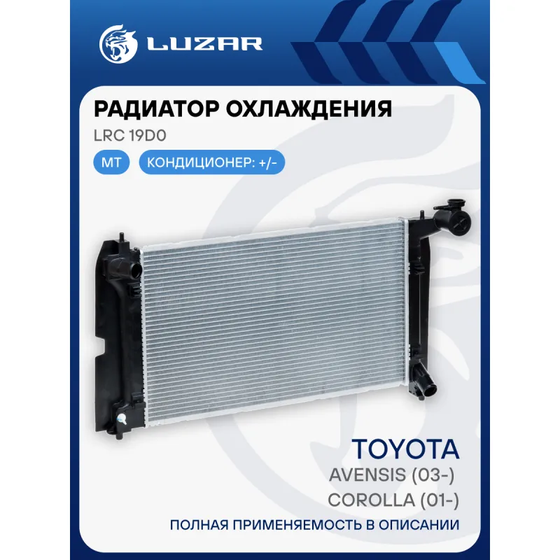 Радиатор охлаждения для автомобилей Toyota Corolla (01-)/Avensis (03-) MT Характеристики: Артикул: LRc 19D0 OEM номера: 16410-YZZ08, 16400-0D120, 16400-0D210, 16400-0D200 Трансмиссия: MT Кондиционер: +/- Длина сердцевины, мм: 600 Высота сердцевины, мм: 373 Толщина сердцевины, мм: 16 Сопутствующий товар: Радиаторы кондиционера (конденсеры): LRAC 1909; LRAC 19D0 Сопутствующий товар: Крышки (пробки) радиатора: LL 1903 Подходит для авто: Toyota Corolla Verso (01-), Corolla E120 (01-), Avensis (03-) Для проверки применяемости отправьте VIN автомобиля через вкладку "Есть вопросы о товаре?" Комплектация: Радиатор охлаждения Паспорт изделия Гарантия: от 1 года.