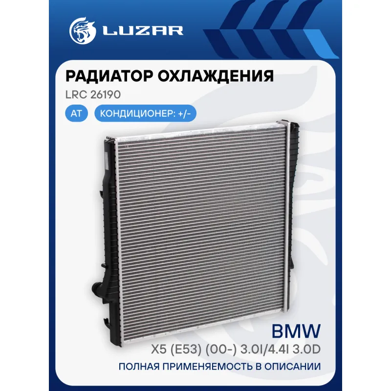 Радиатор охлаждения для автомобилей X5 (E53) (00-) 3.0i/4.4i 3.0d AT Характеристики: Артикул: LRc 26190 OEM номера: 1710 1 439 103, 1710 7 544 668, 1711.1.439.103, 1711.7.544.668 Трансмиссия: AT Кондиционер: +/- Длина сердцевины, мм: 590 Высота сердцевины, мм: 589 Толщина сердцевины, мм: 26 Сопутствующий товар: Электровентиляторы кондиционера: LFAC 26E5 Подходит для авто: BMW X5 E53 (99-), X5 E53 (99-), X5 E53 (99-) Для проверки применяемости отправьте VIN автомобиля через вкладку "Есть вопросы о товаре?" Комплектация: Радиатор охлаждения Паспорт изделия Гарантия: от 1 года.