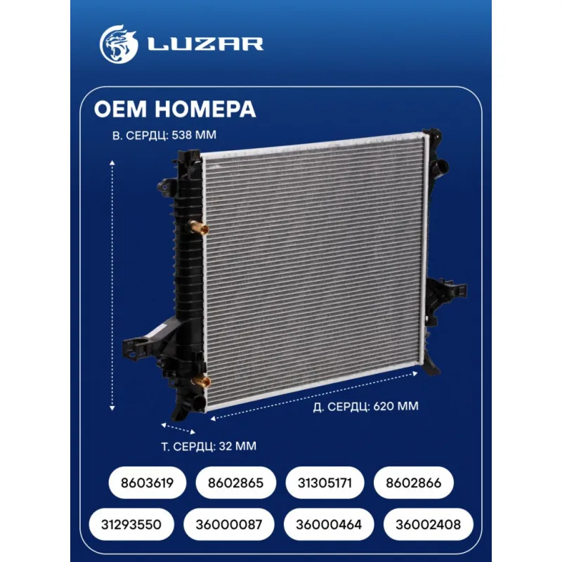 Радиатор охлаждения для автомобилей XC90 (02-) AT Характеристики: Артикул: LRc 10157 OEM номера: 31293550, 36000087, 36000464, 36002408, 860 3619, 860 2865, 31305171, 8602866 Трансмиссия: AT Кондиционер: +/- Длина сердцевины, мм: 620 Высота сердцевины, мм: 538 Толщина сердцевины, мм: 32 Сопутствующий товар: Электровентиляторы охлаждения: LFK 1057 Сопутствующий товар: Радиаторы кондиционера (конденсеры): LRAC 1057; LRAC 1058 Подходит для авто: Volvo XC90 (02-) Для проверки применяемости отправьте VIN автомобиля через вкладку "Есть вопросы о товаре?" Комплектация: Радиатор охлаждения Паспорт изделия Гарантия: от 1 года.