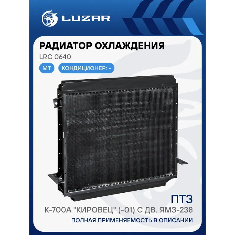 Радиатор охлаждения для трактора К-700A "Кировец" (-01) с дв. ЯМЗ-238 (нижний патрубок 54мм) Характеристики: Артикул: LRc 0640 OEM номера: 700.13.01.000-3, К700-1301010, К700.1301010-3 Трансмиссия: MT Кондиционер: - Длина сердцевины, мм: 1023 Высота сердцевины, мм: 845 Толщина сердцевины, мм: 89 Тип сердцевины: паяная Материал сердцевины: алюминий Материал бачков: сталь Диаметр патрубков: нижний 54мм Подходит для авто: ПТЗ К-700, К-700A, К-702MA Для проверки применяемости отправьте VIN автомобиля через вкладку "Есть вопросы о товаре?" Комплектация: Радиатор охлаждения Паспорт изделия Гарантия: от 1 года.
