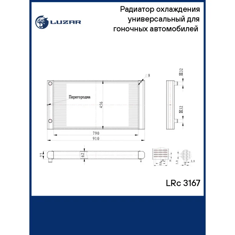 Радиатор охлаждения универсальный для гоночных автомобилей (сердц. 790*456*62мм) Характеристики: Артикул: LRc 3167 OEM номера: LRc 3167 Трансмиссия: MT/AT Кондиционер: +/- Материал сердцевины: алюминий Материал бачков: алюминий Тип сердцевины: паяная, 3-х рядная Сопутствующий товар:: LRIC 3001; LRIC 3006 Длина сердцевины, мм: 790 Толщина сердцевины, мм: 62 Высота сердцевины, мм: 456 Комплектация: Радиатор охлаждения - 1 шт Паспорт изделия - 1 шт Гарантия: от 1 года.