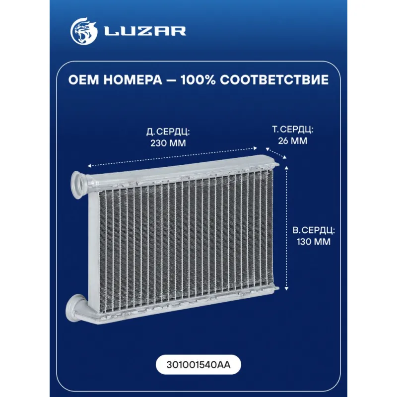 Радиатор отопителя для а/м Omoda C5 (22-)/Chery Arrizo 8 (22-)/Jaecoo J7 (23-) 1.5T/1.6T Характеристики: Артикул: LRh 3022 OEM номера: 301001540AA Тип конструкции: со съемными трубками Трансмиссия: MT/AT Кондиционер: +/- Комплектация: трубки, фиксаторы, уплотнительные кольца Материал бачков: алюминий Тип сердцевины: паяная Длина сердцевины, мм: 230 Толщина сердцевины, мм: 26 Высота сердцевины, мм: 130 Материал сердцевины: алюминий Подходит для авто: OMODA C5 (22-) Chery Arrizo 8 (22-) Jaecoo J7 (23-) Для проверки применяемости отправьте VIN автомобиля через вкладку "Есть вопросы о товаре?" Комплектация: Радиатор отопителя - 1 шт Паспорт изделия - 1 шт Гарантия: от 1 года.