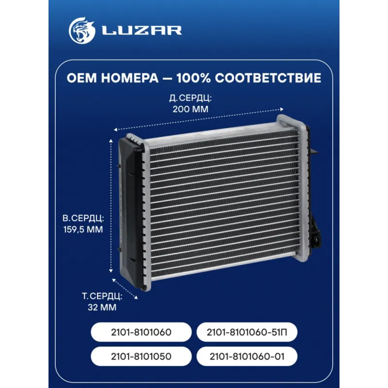 Радиатор отопителя для а/м 2101-2107 (COMFORT, паяный) Характеристики: Артикул: LRh 0101b OEM номера: 2101-8101060, 2101-8101060-51П, 2101-8101050, 2101-8101060-01 Материал бачков: пластик Тип сердцевины: паяная Сопутствующий товар: Электровентиляторы отопителя: LFh 0101 Сопутствующий товар: Патрубки отопления (комплект): LPKh 0101s; LPKh 0101 Длина сердцевины, мм: 200 Толщина сердцевины, мм: 32 Трансмиссия: МТ Кондиционер: - Высота сердцевины, мм: 159,5 Материал сердцевины: алюминий Аналог: LRh 0101 (сборная сердцевина) Подходит для авто: ВАЗ 1111 (Ока), 2101, 2102, 2103, 2106, 2104, 2105, 2107, 2107, 21053, 21073, 2104, 2131, 2131, 2120, 2121, 2121 SeAZ 11116 VIS 2345 Для проверки применяемости отправьте VIN автомобиля через вкладку "Есть вопросы о товаре?" Комплектация: Радиатор отопителя Паспорт изделия Гарантия: от 1 года.