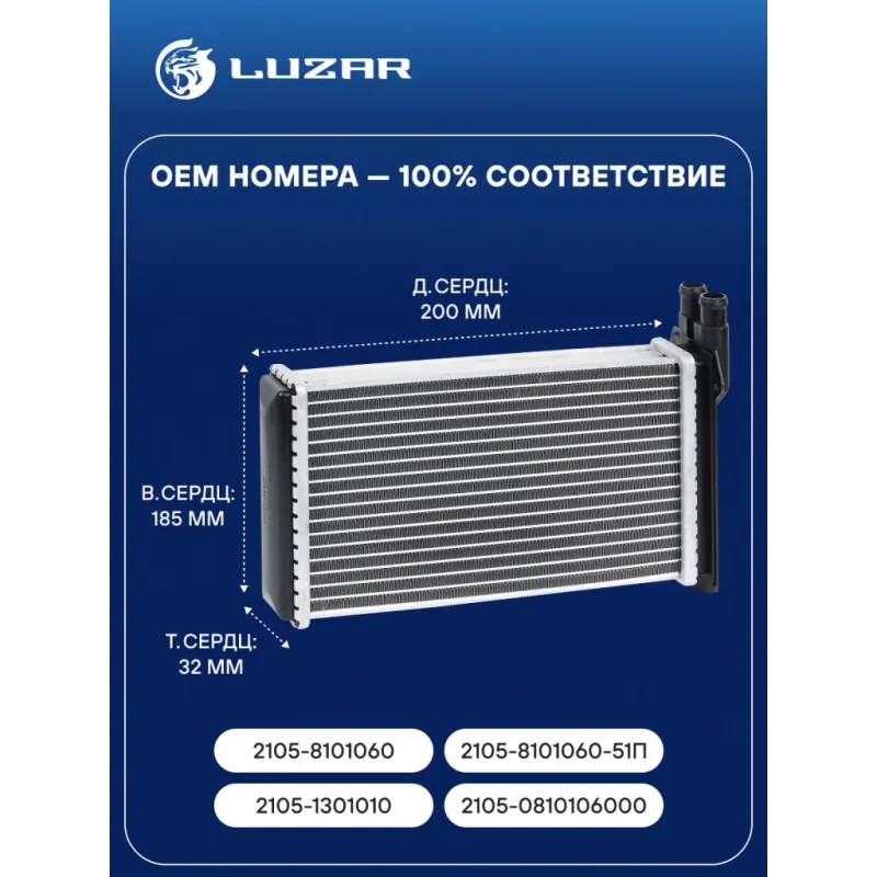 Радиатор отопителя для автомобилей 2104-07 (алюм., COMFORT, паяный) Характеристики: Артикул: LRh 0105b OEM номера: 2105-8101060, 2105-8101060-51П, 2105-1301010, 2105-0810106000 Материал бачков: пластик Тип сердцевины: паяная Сопутствующий товар: Электровентиляторы отопителя: LFh 0101 Сопутствующий товар: Патрубки отопления (комплект): LPKh 0101s; LPKh 0101 Длина сердцевины, мм: 200 Толщина сердцевины, мм: 32 Трансмиссия: МТ Кондиционер: - Высота сердцевины, мм: 185 Материал сердцевины: алюминий Аналог: LRh 0106 (сборная сердцевина) Подходит для авто: ВАЗ 1111 (Ока), 2106, 2106, 2104, 2105, 2105, 2107, 2107, 2107, 21053, 21073, 2104, 21213, 21214, 2131 SeAZ 11116 VIS 2345 Для проверки применяемости отправьте VIN автомобиля через вкладку "Есть вопросы о товаре?" Комплектация: Радиатор отопителя Паспорт изделия Гарантия: от 1 года.