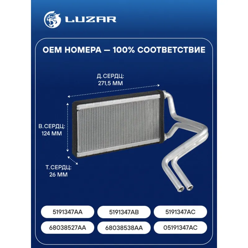 Радиатор отопителя для а/м Dodge Caliber (06-)/Journey (07-)/Avenger (07-)/Chrysler Sebring (06-) Характеристики: Артикул: LRh 0334 OEM номера: 5191347AA, 5191347AB, 5191347AC, 68038527AA, 68038538AA, 05191347AC Тип конструкции: с трубками в сборе Трансмиссия: MT/AT Кондиционер: +/- Материал бачков: алюминий Тип сердцевины: паяная Сопутствующий товар: Электровентиляторы отопителя: LFh 23LL Длина сердцевины, мм: 271,5 Толщина сердцевины, мм: 26 Высота сердцевины, мм: 124 Материал сердцевины: алюминий Подходит для авто: Dodge Caliber (07-), Jorney (09-), Avenger (07-) Chrysler Sebring III (07-) Для проверки применяемости отправьте VIN автомобиля через вкладку "Есть вопросы о товаре?" Комплектация: Радиатор отопителя Паспорт изделия Гарантия: от 1 года.