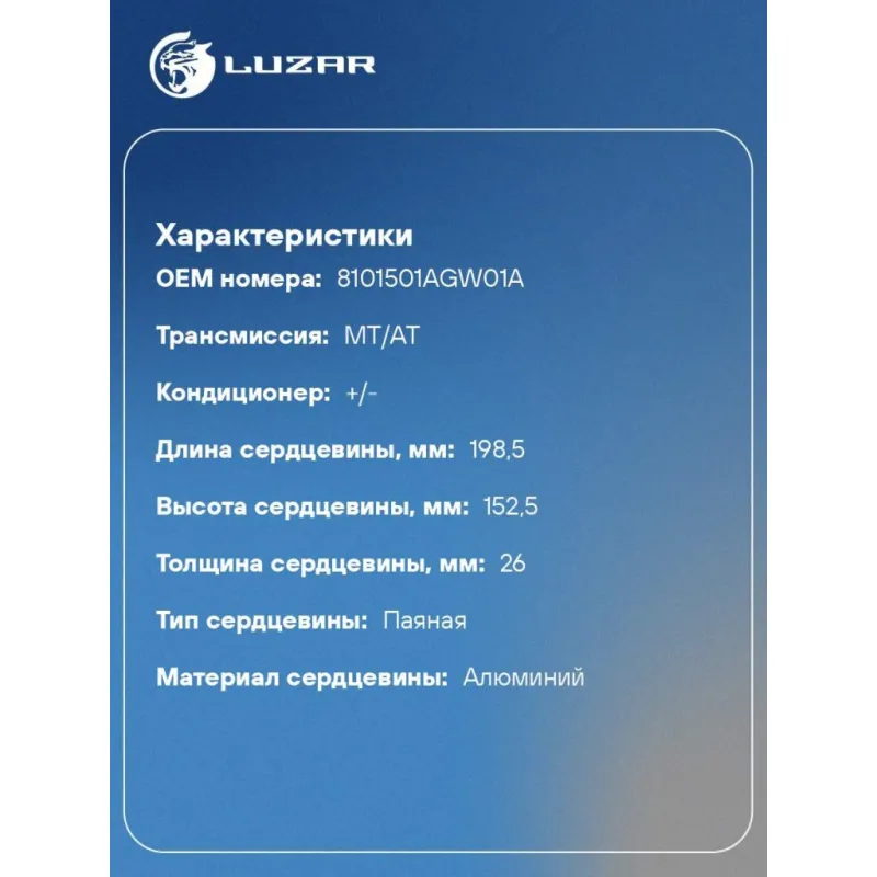 Радиатор отопителя для а/м Haval Dargo (22-) Характеристики: Артикул: LRh 3047 OEM номера: 8101501AGW01A Тип конструкции: с трубками в сборе Трансмиссия: MT/AT Кондиционер: +/- Материал бачков: алюминий Тип сердцевины: паяная Длина сердцевины, мм: 198,5 Толщина сердцевины, мм: 26 Высота сердцевины, мм: 152,5 Материал сердцевины:... Читать полностью →