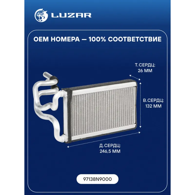 Радиатор отопителя для а/м Hyundai Tucson IV (20-) Характеристики: Артикул: LRh 0828 OEM номера: 97138N9000 Тип конструкции: с трубками в сборе Трансмиссия: MT/AT Кондиционер: +/- Материал бачков: алюминий Тип сердцевины: паяная Сопутствующий товар: Электровентиляторы отопителя: LFh 0849 Длина сердцевины, мм: 246,5 Толщина сердцевины, мм: 26 Высота сердцевины, мм: 132 Материал сердцевины: алюминий Подходит для авто: Hyundai Tucson IV (20-) Для проверки применяемости отправьте VIN автомобиля через вкладку "Есть вопросы о товаре?" Комплектация: Радиатор отопителя - 1 шт Паспорт изделия - 1 шт Гарантия: от 1 года.