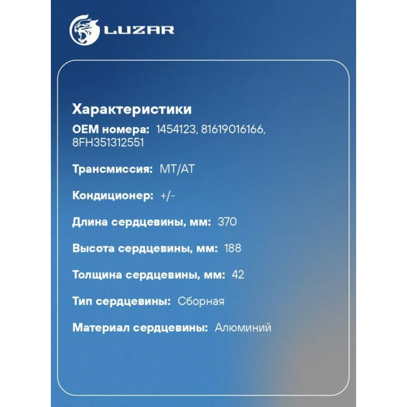 Радиатор отопителя для а/м MAN TGA (02-)/TGS (07-)/TGX (07-)/DAF XF 105 (05-)/XF 106 (13-) (сборный) Характеристики: Артикул: LRh 2806 OEM номера: 1454123, 81619016166, 8FH351312551 Трансмиссия: MT/AT Кондиционер: +/- Материал бачков: пластик Тип сердцевины: сборная Сопутствующий товар: Электровентиляторы отопителя: LFh 1201; LFh 2801 Длина сердцевины, мм: 370 Толщина сердцевины, мм: 42 Высота сердцевины, мм: 188 Материал сердцевины: алюминий Комплектация: Радиатор отопителя Паспорт изделия Гарантия: от 1 года.