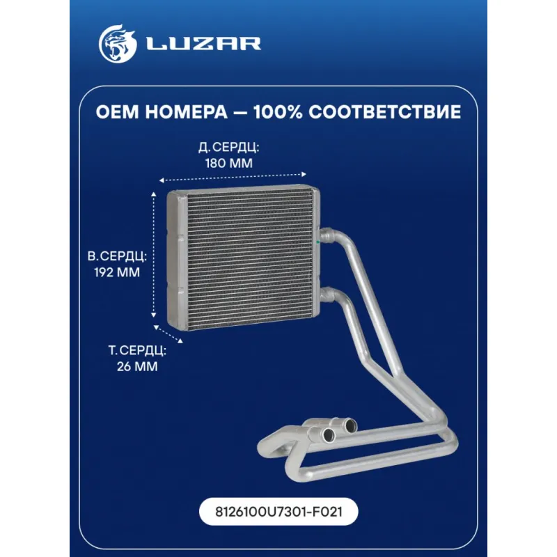 Радиатор отопителя для а/м Москвич 3 (22-)/6 (23-)/JAC J7 (20-)/JS4 (20-) Характеристики: Артикул: LRh 3032 OEM номера: 8126100U7301-F021 Тип конструкции: с трубками в сборе Трансмиссия: MT/AT Кондиционер: +/- Материал бачков: алюминий Тип сердцевины: паяная Длина сердцевины, мм: 180 Толщина сердцевины, мм: 26 Высота сердцевины, мм: 192 Материал сердцевины: алюминий Подходит для авто: MOSKVICH 3 (22-) JAC JS4 (20-), J7 (20-) Для проверки применяемости отправьте VIN автомобиля через вкладку "Есть вопросы о товаре?" Комплектация: Радиатор отопителя - 1 шт Паспорт изделия - 1 шт Гарантия: от 1 года.