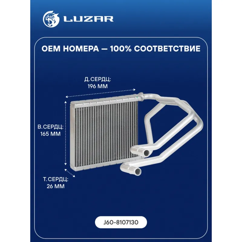 Радиатор отопителя для а/м Omoda S5 (22-)/Kaiyi E5 (21-) 1.5T Характеристики: Артикул: LRh 3034 OEM номера: J60-8107130 Тип конструкции: с трубками в сборе Трансмиссия: MT/AT Кондиционер: +/- Материал бачков: алюминий Тип сердцевины: паяная Длина сердцевины, мм: 196 Толщина сердцевины, мм: 26 Высота сердцевины, мм: 165 Материал ... Читать полностью →