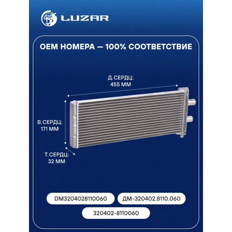 Радиатор отопителя для автобусов Вектор Next 3204/320405 Характеристики: Артикул: LRh 0304 OEM номера: 320402-8110060, DM3204028110060, ДМ-320402.8110.060 Материал бачков: алюминий Трансмиссия: MT Кондиционер: +/- Длина сердцевины, мм: 455 Высота сердцевины, мм: 171 Толщина сердцевины, мм: 32 Тип сердцевины: паяная Материал сердцевины: алюминий Материал: алюминий Примечание: ширина трубок сердцевины 32мм Подходит для авто: ПАЗ 320405 «Вектор Next», 3204, 320402, 320412 Для проверки применяемости отправьте VIN автомобиля через вкладку "Есть вопросы о товаре?" Комплектация: Радиатор отопителя Паспорт изделия Гарантия: от 1 года.