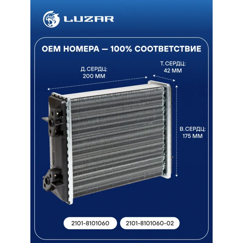 Радиатор отопителя для а/м Лада 2101-2107 (узкий) (сборный) Характеристики: Артикул: LRh 0101 OEM номера: 2101-8101060, 2101-8101060-02 Материал бачков: пластик Трансмиссия: MT Кондиционер: - Длина сердцевины, мм: 200 Высота сердцевины, мм: 175 Толщина сердцевины, мм: 42 Тип сердцевины: сборная Материал сердцевины: алюминий Аналог: LRh 0101b (паяная сердцевина) Подходит для авто: ВАЗ 2103, 2106, 2104, 2105, 2107, 2107, 1111 (Ока), 2101, 2102, 21213, 2104, 2120, 2121, 2121, 21214 Urban (14-) VIS 2345 Для проверки применяемости отправьте VIN автомобиля через вкладку "Есть вопросы о товаре?" Комплектация: Радиатор отопителя Паспорт изделия Гарантия: от 1 года.
