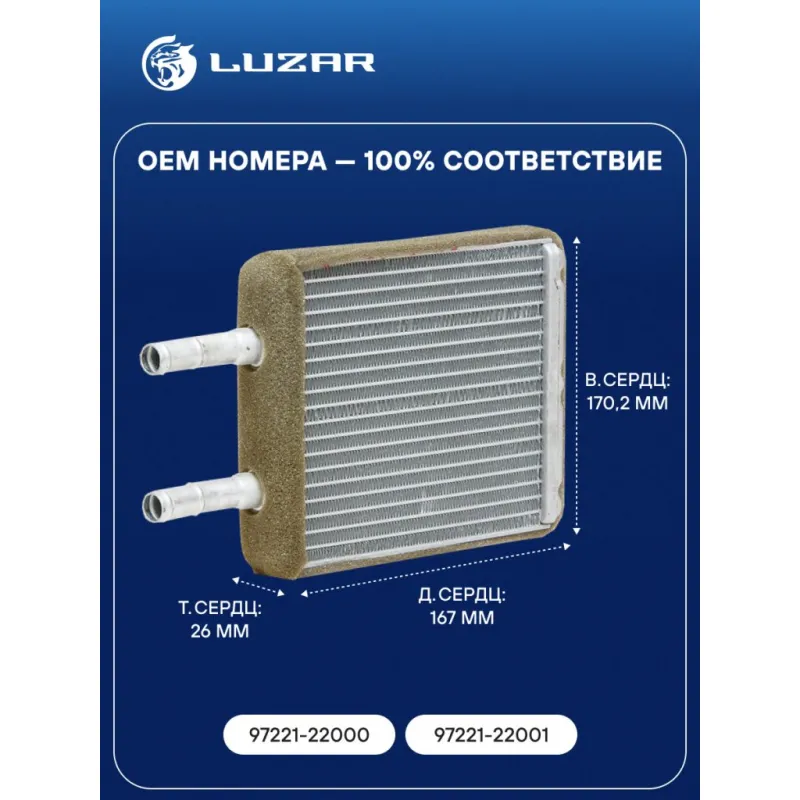 Радиатор отопителя для автомобилей Accent (94-) Характеристики: Артикул: LRh HUAc94320 OEM номера: 97221-22000, 97221-22001 Материал бачков: алюминий Тип сердцевины: паяная Сопутствующий товар: Патрубки отопления (комплект): LPKh 08108, LPKh 08109, LPKh 08110, LPKh 08111, LPKh 08112 Трансмиссия: MT/AT Кондиционер: +/- Длина сердцевины, мм: 167 Высота сердцевины, мм: 170.2 Толщина сердцевины, мм: 26 Материал сердцевины: алюминий Сопутствующий товар: Электровентиляторы отопителя: LFh 18K1 Подходит для авто: Hyundai Pony (82-), Pony (82-), Accent II (99-), Accent II (TagAZ) (01-), Coupe I (96-), Lantra II (95-), Accent I (94-) Для проверки применяемости отправьте VIN автомобиля через вкладку "Есть вопросы о товаре?" Комплектация: Радиатор отопителя Паспорт изделия Гарантия: от 1 года.