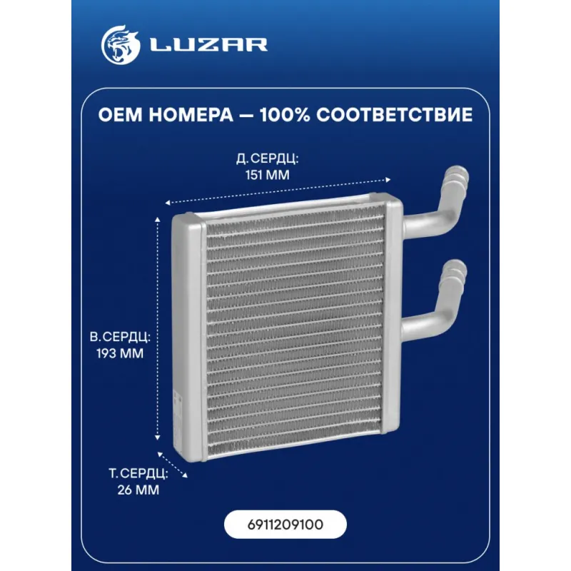Радиатор отопителя для автомобилей Actyon (05-)/Kyron (05-) Характеристики: Артикул: LRh 1750 OEM номера: 6911209100 Тип конструкции: с трубками в сборе Трансмиссия: MT/AT Кондиционер: +/- Материал сердцевины: алюминий Материал бачков: алюминий Тип сердцевины: паяная Длина сердцевины, мм: 151 Толщина сердцевины, мм: 26 Высота сердцевины, мм: 193 Подходит для авто: SsangYong Kyron (05-), Actyon (05-) Для проверки применяемости отправьте VIN автомобиля через вкладку "Есть вопросы о товаре?" Комплектация: Радиатор отопления Паспорт изделия Гарантия: от 1 года.