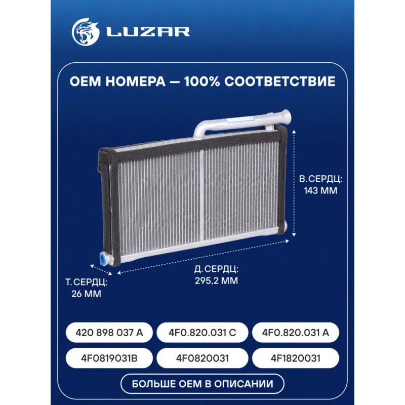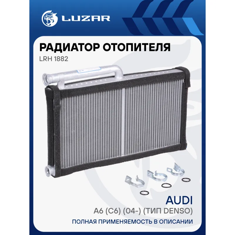 Радиатор отопителя для автомобилей Audi A6 (C6) (04-) (тип Denso) Характеристики: Артикул: LRh 1882 OEM номера: 420 898 037 A, 4F0.820.031 C, 4F0.820.031 A, 4F0819031B, 4F0820031, 4F1820031, 4F2820031 Материал бачков: алюминий Тип сердцевины: паяная Трансмиссия: MT/AT Кондиционер: +/- Длина сердцевины, мм: 295,2 Высота сердцевины, мм: 143 Толщина сердцевины, мм: 26 Материал сердцевины: алюминий Сопутствующий товар: Электровентиляторы отопителя: LFh 1860 Сопутствующий товар: Элементы для уплотнения соединений: LGS 0006 Подходит для авто: Audi A6 C6 (04-) Для проверки применяемости отправьте VIN автомобиля через вкладку "Есть вопросы о товаре?" Комплектация: Радиатор отопителя Паспорт изделия Гарантия: от 1 года.